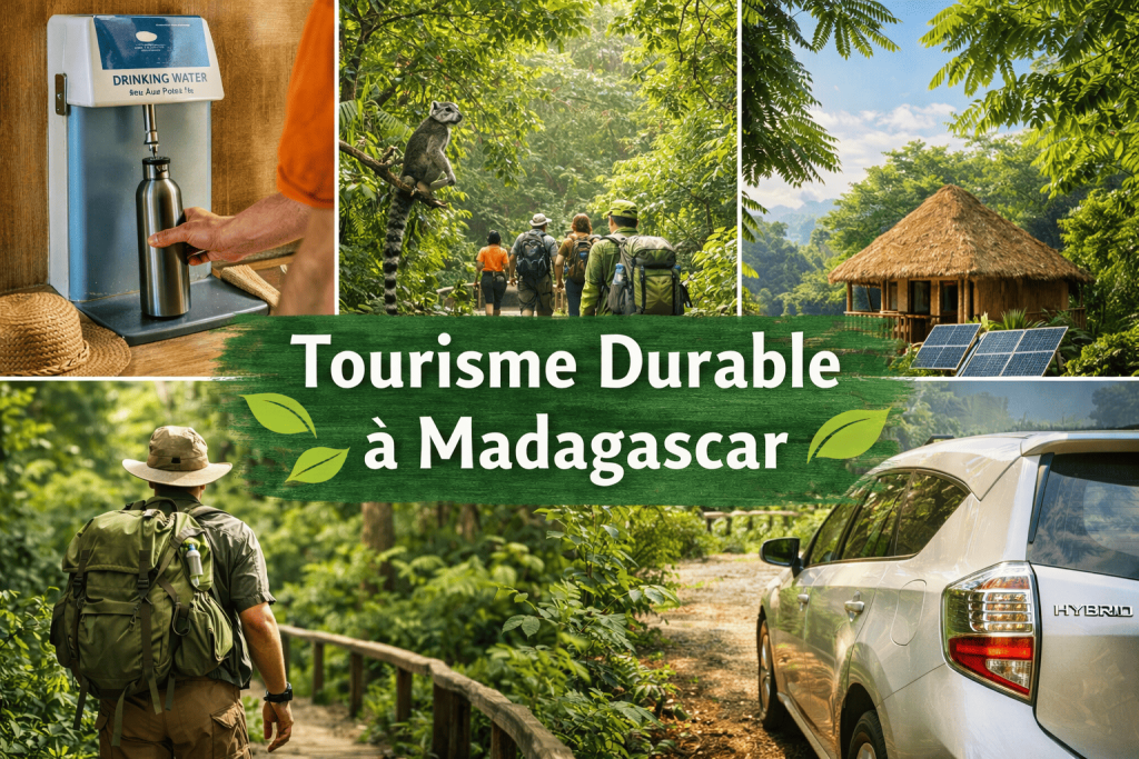 Digital collage showing eco-tourism in Madagascar: a man filling a reusable water bottle, hikers in a tropical rainforest, and a hybrid car near a traditional hut with solar panels.